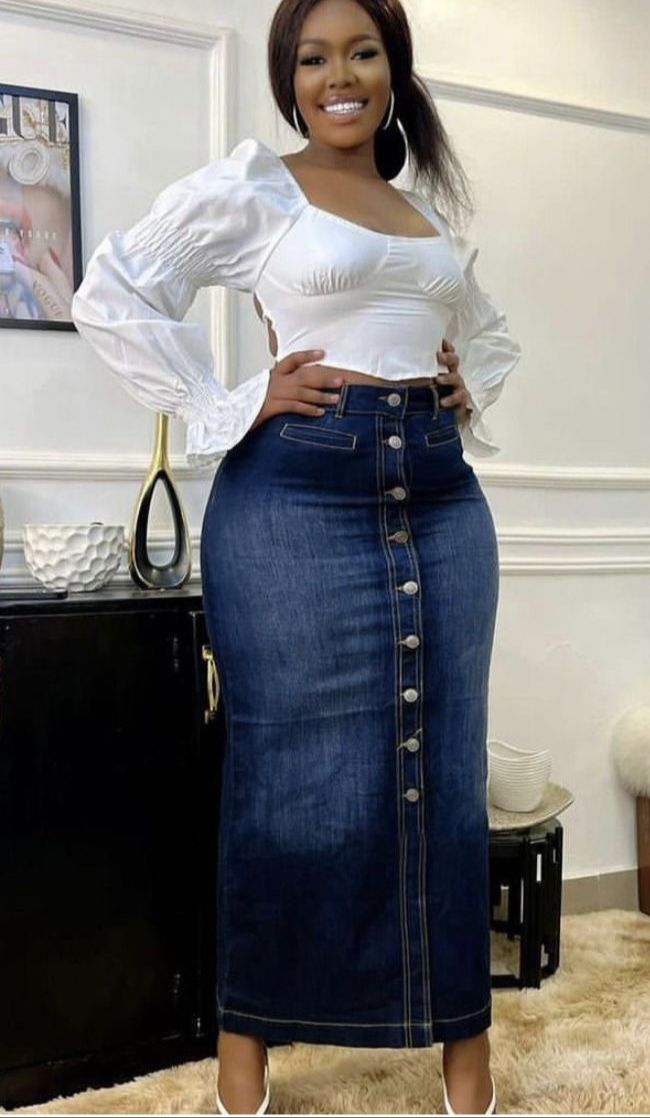 Bring sleek style to your wardrobe with this denim button-down skirt. Featuring front buttons, two back pockets, and slight stretch for comfort, this stylish piece ends just above the ankle. The perfect way to look chic and yet remain comfortable!
