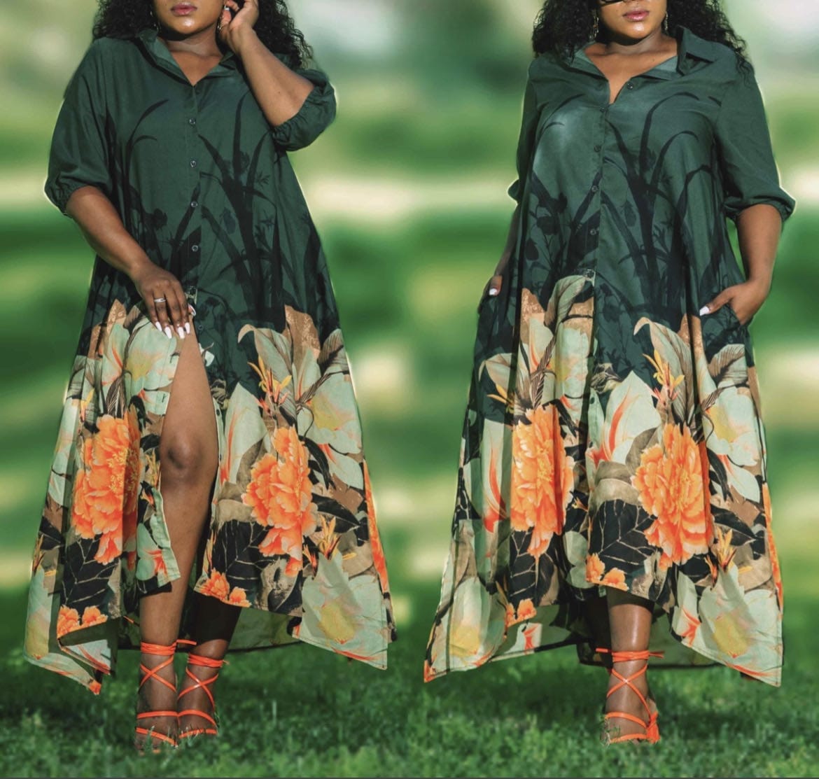 This floral shirt dress offers a relaxed, oversized fit for comfort and effortless style. Designed with a big cut, it provides full coverage while maintaining a flattering silhouette. The vibrant floral pattern adds a touch of elegance, making it perfect for both casual and semi-formal occasions. Crafted to balance breathability and coverage, this dress is a versatile addition to your wardrobe.