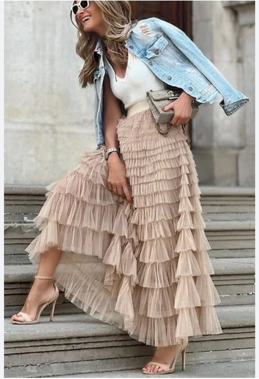 This full-length gauze ruffle skirt is perfect for your wardrobe. Made from a premium lightweight fabric, it features an elasticated waist to ensure a perfect fit for everyone. The ruffle detailing adds a unique, stylish flare to any outfit.